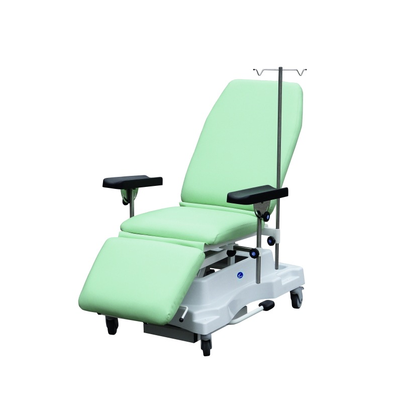 Fotel zabiegowy, do dializ, pooperacyjny z odchylanym siedziskiem Fotel zabiegowy, do dializ, pooperacyjny z odchylanym siedziskiem, to nowoczesny fotel zabiegowy zaprojektowany z myślą o pacjentach poddawanych dializom oraz osobach wymagających opieki pooperacyjnej. Konstrukcja łączy komfort użytkownika z funkcjonalnością niezbędną w codziennej pracy personelu medycznego. Fotel posiada 3-segmentowe leżysko, którego ustawienie można płynnie regulować. Dzięki zastosowaniu sprężyn gazowych możliwe jest szybkie i wygodne przechodzenie między pozycją leżącą, siedzącą oraz ustawieniami pośrednimi. Rozwiązanie to pozwala dopasować ułożenie pacjenta do rodzaju wykonywanego zabiegu oraz jego indywidualnych potrzeb.